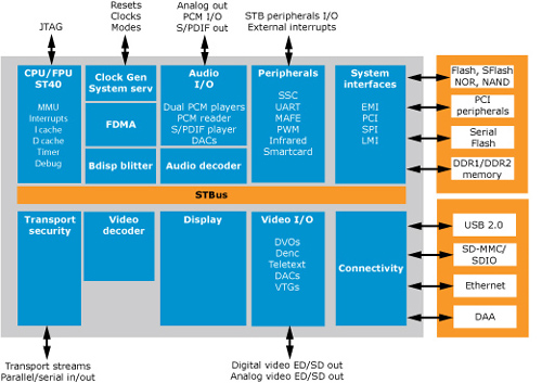 The complete decoder system-on-chip handles standard-definition MPEG2, H.264, AVS and VC-1/WMV9 streams at high speed using a dedicated on-chip video processor and ST’s DELTA video decoding system. It also decodes web-based content such as Flash, MPEG-4 (Part 2), and MJPEG. Advanced security features include DVB, DES, AES, Multi-2 and ICAM descramblers, built-in smartcard interfaces, and SVP, MS-DRM and DTCP-IP content protection. These provide robust prevention of signal theft and protect revenues for conditional-access service providers.