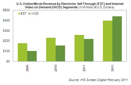 Reflecting consumers’ increasing preference for renting movies rather than owning them, U.S. movie Internet video on demand (iVOD) revenue will rise to exceed that of electronic sell-through (EST) for the first time ever in 2013, according to new IHS Screen Digest research.