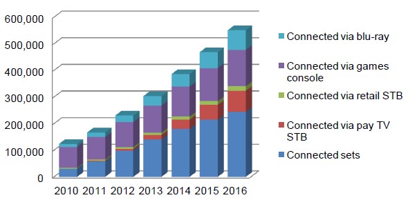 The gross proportion of TV households with a connected set will be 43% by 2016, up from 11% in 2010. Report author Simon Murray explains: “These are gross figures as it is possible that one TV household can have several sets connected to the Internet. For example, a TV household could own a connected TV set, and may also have a connected fixed games console. This report identifies five different ways by which a set can be connected to the Internet – and one form of connection does not exclude the other forms.”