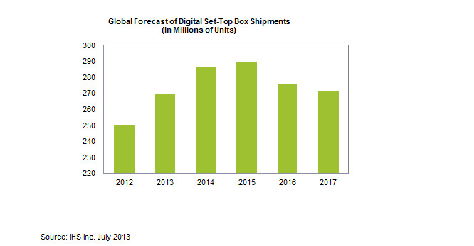 Global shipments of STBs used for cable, satellite, terrestrial and Internet protocol television (IPTV) digital TV services are forecast to climb to 269 million units this year, up 8 percent from 250 million in 2012, according to the latest IHS Set-Top Box Market Monitor report from information and analytics provider IHS (NYSE: IHS). Shipments will grow another 6 percent to 286 million in 2014 and by 1 percent to 290 million in 2015. The year 2015 will represent the peak of the market for the foreseeable future.