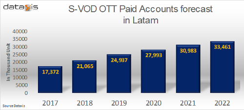 According to Dataxis, Subscription Video on Demand (SVOD) services are showing great potential growth in Latin America and are expected to reach 17.4 million in 2017. Moreover, Dataxis forecasts that the market will double in volume to reach 33.5 million in 2022.
