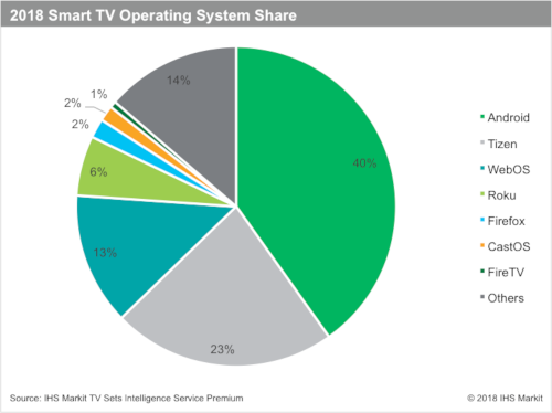 Android is currently the most popular smart TV operating system platform, including both the full Android TV implementation and modified versions used by many Chinese TV brands. IHS Markit expects Android will continue to gain share through 2022, as a common third-party platform with native support for Google Home. Proprietary smart TV platforms from Samsung (Tizen) and LGE (WebOS) are the second- and third-most popular smart TV operating system platforms.