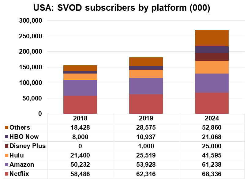 Simon Murray, Principal Analyst at Digital TV Research, explained: “Several high profile SVOD launches are imminent. We expect that Disney+ will have 25 million US subscribers by 2024. Apple TV+’s growth will be more modest at 8 million by 2024. This means that Netflix’s share of the total will fall from 37% in 2018 to 25% in 2024 – despite the company adding 10 million subscribers.”