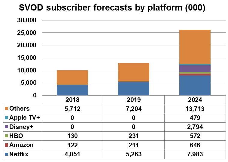 Simon Murray, Principal Analyst at Digital TV Research, said: “The imminent launches of both Disney+ and Apple TV+ will further boost the sector. We forecast nearly 3 million subscribers for Disney+ by 2024. Apple TV+ will be more modest.”