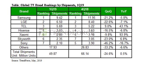 WitsView, a division of TrendForce, has it in its latest report that shipments of TV brands worldwide came to 49.87 million units for 1Q19, a QoQ slide of 24.6% and a YoY bump of 0.5%. One may discover from the brand shipment rankings that first and second place are still the domain of Korean brands, while China brands fill up third to sixth, evidently proving themselves a force to be reckoned with in their ambitions to aggressively raise market share by leveraging their cost advantage.