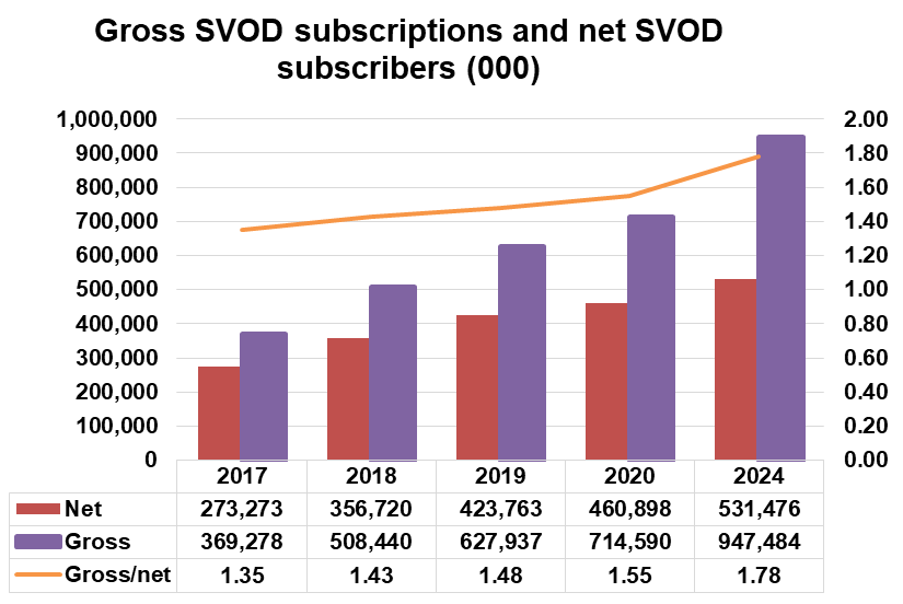 As the gross subscription total races towards 1 billion, the net subscriber count will rise by 175 million between 2018 and 2024 to reach 531 million. This means that the average SVOD subscriber will pay for 1.78 SVOD subscriptions by 2024 – up from 1.43 in 2018.