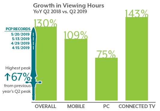 • Device wars rage on. The connected TV category led all other devices in growth, up 143% in viewing hours. This was largely driven by Roku with 173% growth and an overall 43% share of connected TV viewing. Amazon Fire TV was up 145% in viewing with an 18% share. Apple TV was up 129% to account for a 10% share.