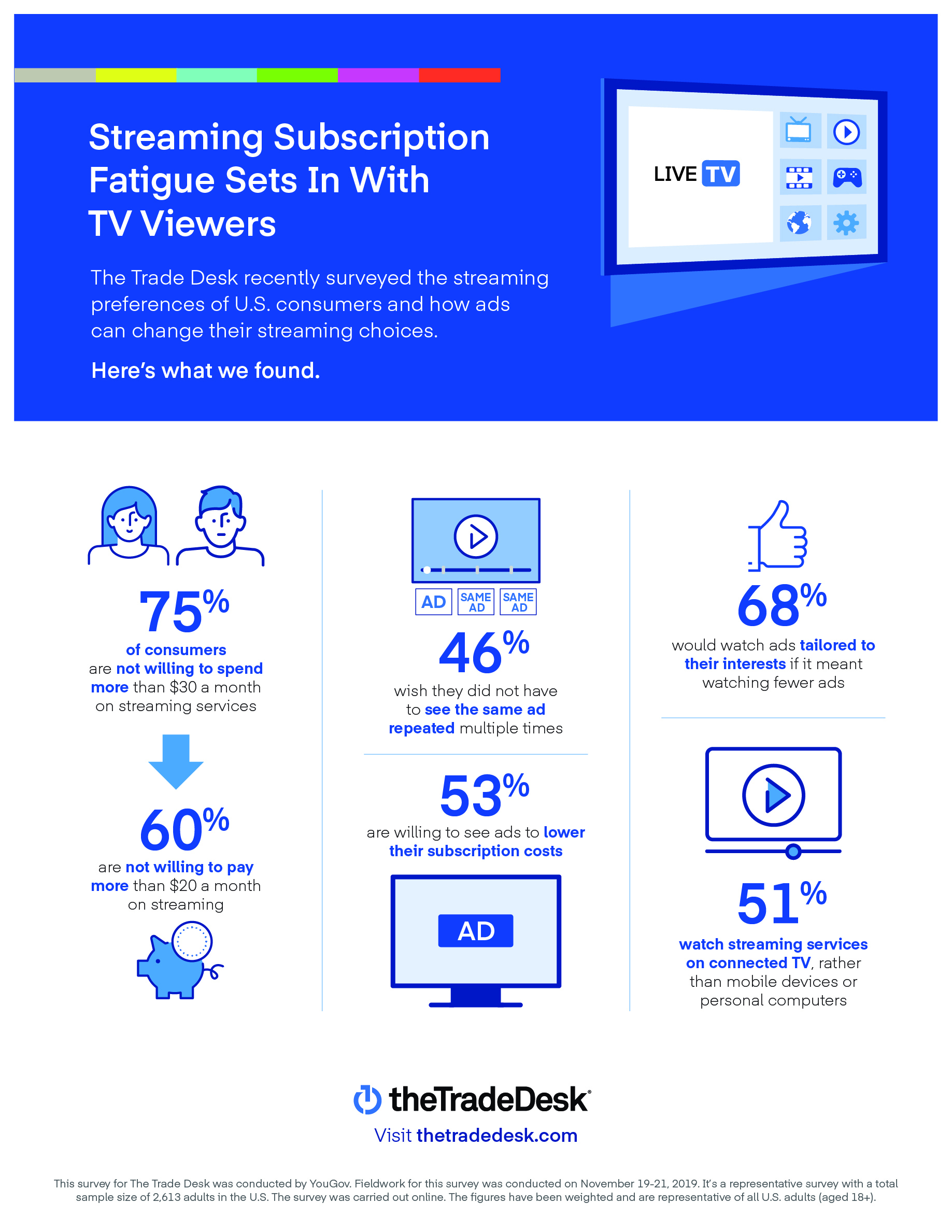 “With consumers experiencing subscription fatigue and unwilling to subscribe to more than one or two premium services, broadcasters have to figure out how to continue to fund this new golden age of TV,” said Brian Stempeck, Chief Strategy Officer, The Trade Desk. “At the same time, consumers are willing to view ads if it means their subscription costs go down, even more so if those ads are relevant to their interests and are just not the same ads over and over again. This indicates that ads will fund the future of streaming TV, and that broadcasters and advertisers have an opportunity to improve the advertising experience in a way that simply is not possible with traditional, linear TV.”