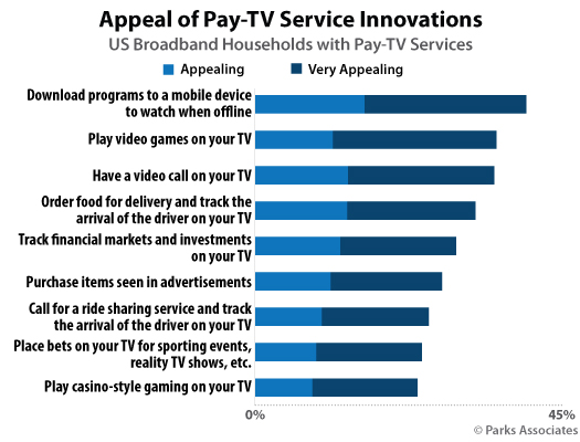 New research from Parks Associates finds over one-quarter of US broadband households are interested in innovative offerings accessed via television, such as offline viewing, video gaming, food delivery, ride sharing, and gambling.