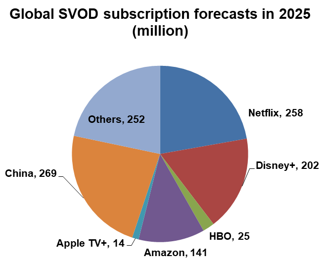 Global SVOD subscriptions will increase by 519 million between 2019 and 2025 to 1,161 million – or up by 81%. The total will climb by 170 million in 2020 alone.