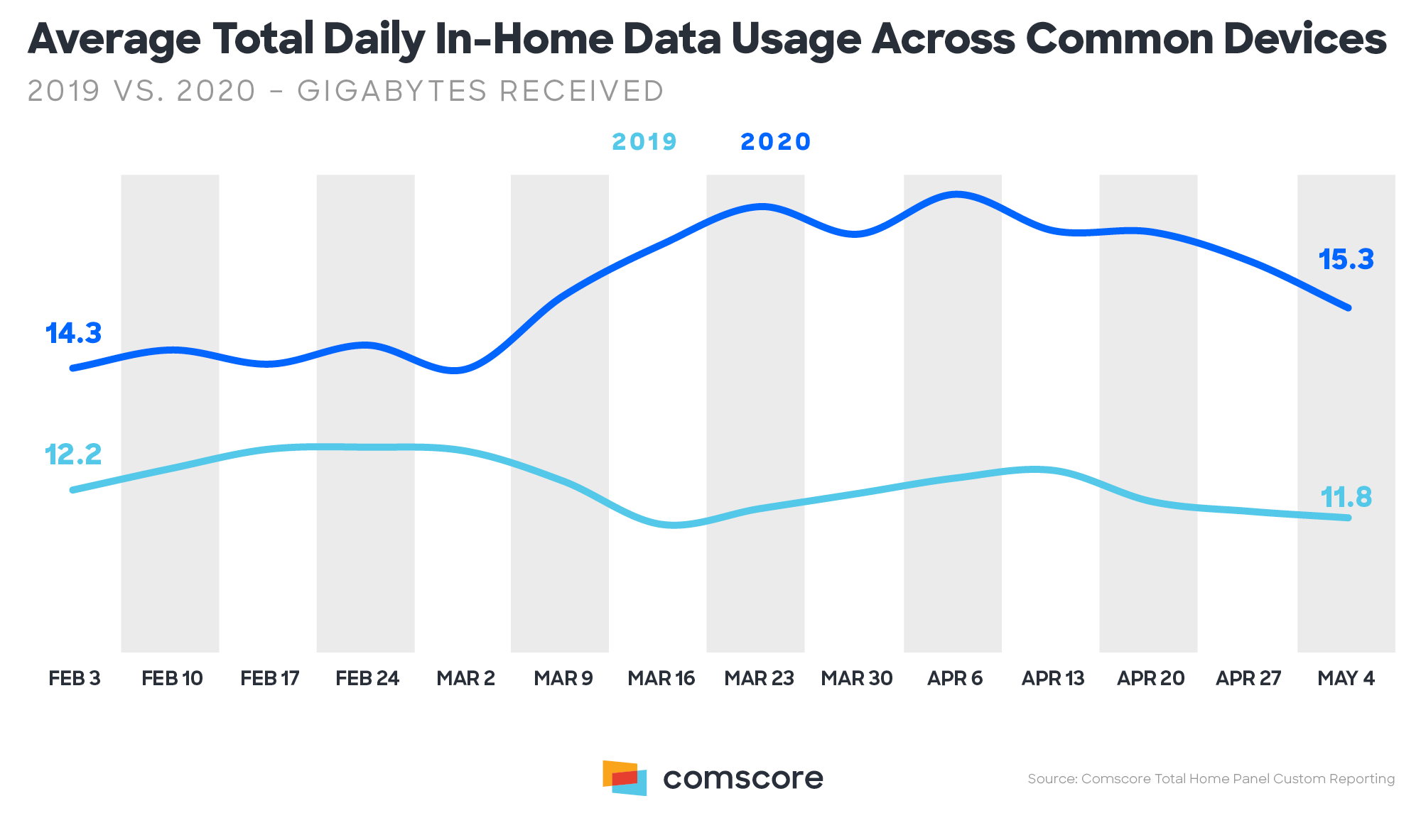 Overall, average in-home data consumption was up 33 percent during the first ten days of May 2020 compared to the first ten days of May 2019 (May 1-10, 2020 versus May 1-10, 2019). This follows 28 percent and 36 percent year-over-year increases in March and April 2020, respectively. Smart TVs, mobile phones, streaming boxes/sticks, and smart speakers are driving the year-over-year growth trends.