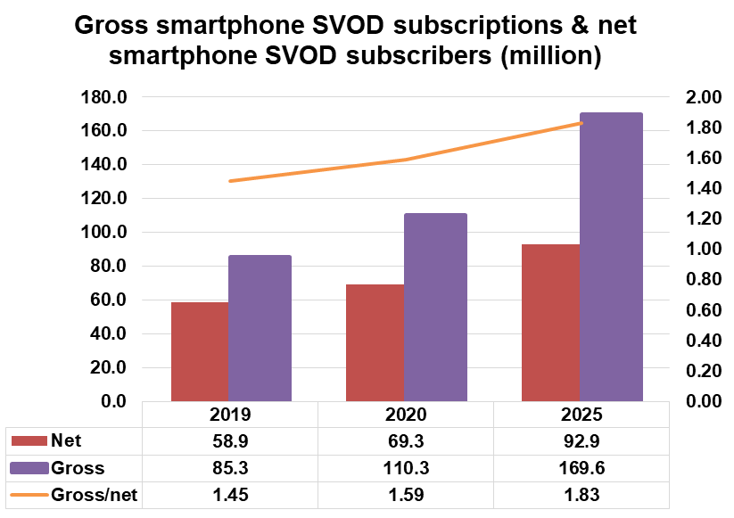 The net smartphone SVOD subscriber count will rise by 34 million between 2019 and 2025 to reach 93 million – lower growth than gross subscriptions.
