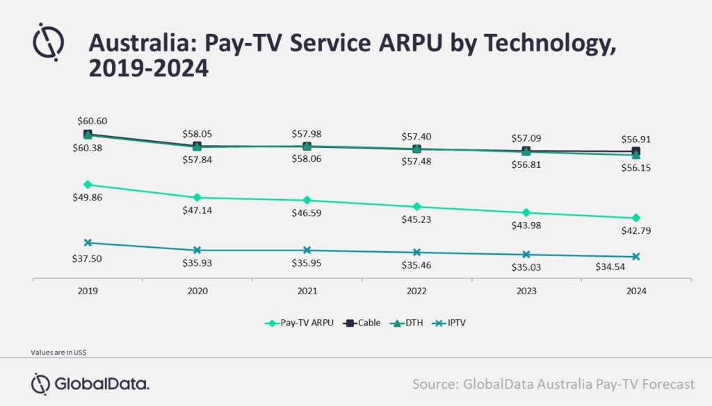 The total pay-TV services revenue in Australia is set to decline at a compound annual growth rate (CAGR) of 3.2% from US$2.6bn in 2019 to US$2.2bn in 2024 due to the declining cable and direct-to-Home (DTH) TV subscriptions and falling pay-TV average revenue per user (ARPU), according to GlobalData, a leading data and analytics company.