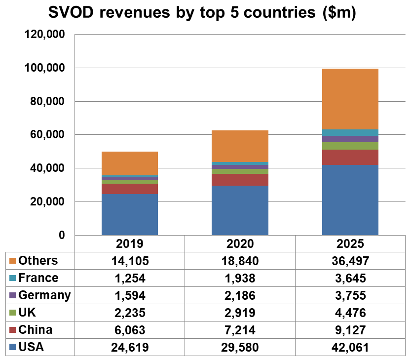The US will remain the SVOD revenue leader by a considerable distance – adding nearly $18 billion between 2019 and 2025 to take its total to $42 billion. However, its share of global SVOD revenues will fall from 49% in 2019 to 42% in 2025.