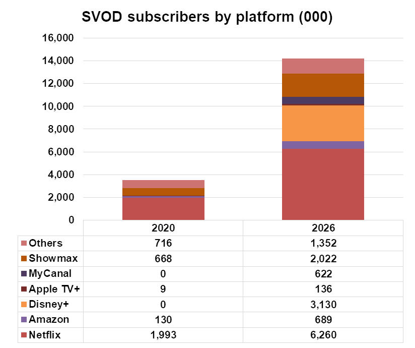 Netflix accounted for 57% of the region’s SVOD subscribers by end-2020. Its share will fall to 44% by 2026 (6.26 million subscribers – but triple from 1.99 million in 2020).