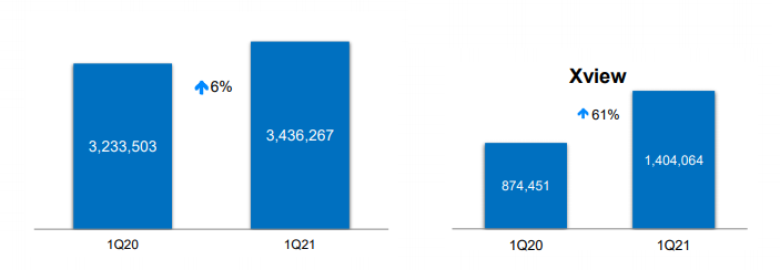 4Q 2020 4Q 2019 % Var --------- --------- ----- Video 3,412,627 3,224,798 5.8% - Xview 1,157,458 827,109 39.9% 1Q 2021 1Q 2020 % Var --------- --------- ----- Video 3,436,267 3,233,503 6.3% - Xview 1,404,064 874,451 60.6% 2Q 2021 2Q 2020 % Var --------- --------- ----- Video 3,457,531 3,261,357 6.0% - Xview 2,060,455 1,076,409 91.4%