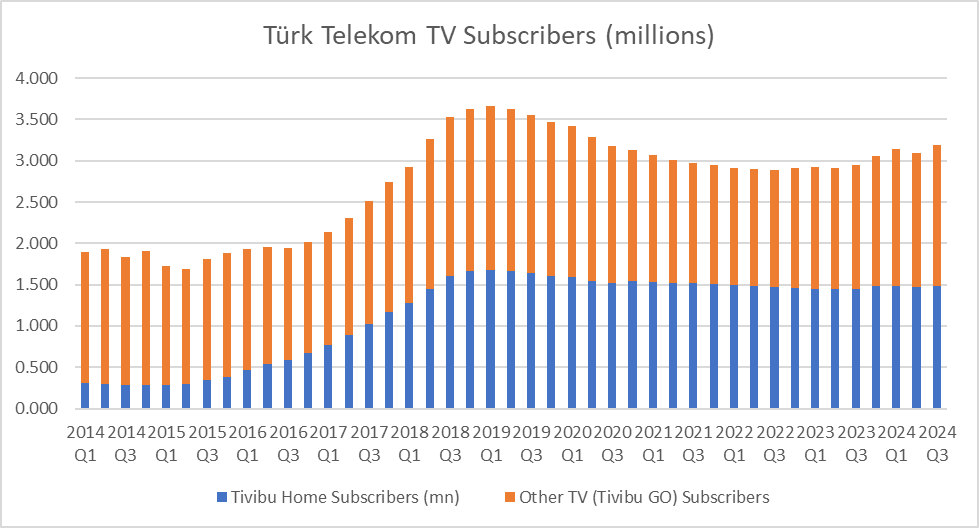 2021 Q1 2021 Q2 2021 Q3 2021 Q4 2022 Q1 2022 Q2 2022 Q3 2022 Q4 ------- ------- ------- ------- ------- ------- ------- ------- Total TV[1] 3.074 3.013 2.973 2.945 2.917 2.901 2.888 2.916 Tivibu Home[2] 1.534 1.518 1.516 1.511 1.494 1.482 1.475 1.462 2023 Q1 2023 Q2 2023 Q3 2023 Q4 2024 Q1 2024 Q2 2024 Q3 2024 Q4 ------- ------- ------- ------- ------- ------- ------- ------- Total TV[1] 2.920 2.916 2.949 3.055 3.140 3.098 3.188 Tivibu Home[2] 1.447 1.443 1.451 1.479 1.483 1.466 1.486
