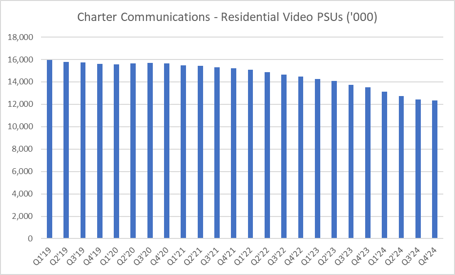 Total video customers decreased by 123,000 in the fourth quarter of 2024, compared to a decline of 257,000 in the fourth quarter of 2023, with the improvement driven by new and simplified pricing and packaging launched in September. As of December 31, 2024, Charter had 12.9 million total video customers.